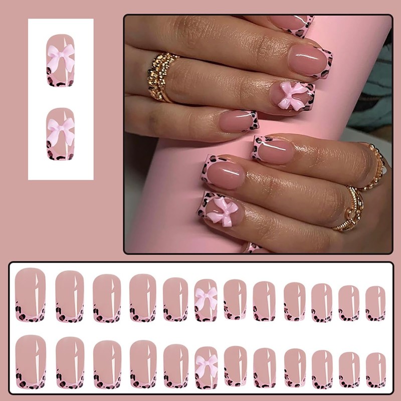24Pcs Leopard French Tip Press on Nails Square Short Fake Nails with Pink Bow Rhinestones Design Pink False Nails Cute Full Cover Glue on Nails Bow Acrylic Artificial Nails for Women Salon Manicure