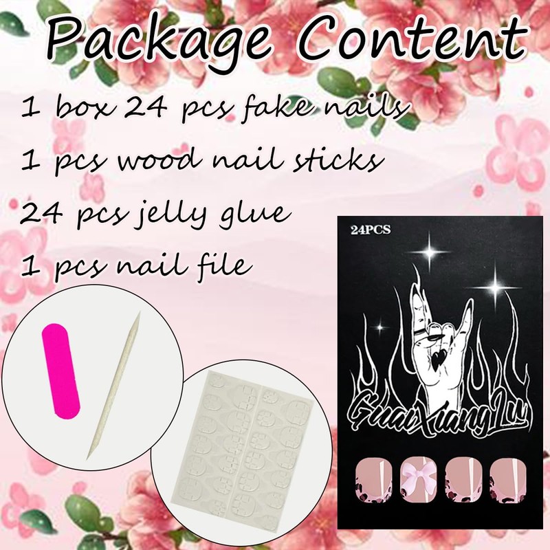 - Bow Charms Nails Kit : 24 PCS ,12 different sizes of french short press on nails , 24 jelly glue, 1 nail file, 1 wooden stick. A full range of tools meet all your wearing needs. It can be worn repeatedly so that you can replace it at any time