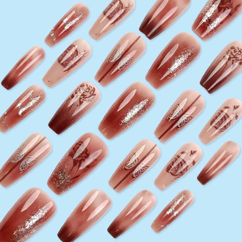 24Pcs Medium Coffin Press on Nails Fall Brown Fake Nails Gradient French Tip Acrylic Press ons Butterfly Flower Design Artificial False Nails Natural Full Cover Stick on Nails for Women and Girls