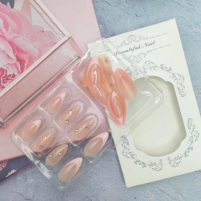 - Package: Our star fake nails is exquisite and beautiful. It contains 24 pcs medium almond press on nails and a set of DIY nail art tools (24 jelly glues+1 wood stick+1 nail file), there are 12 different sizes of fake nails, which is very suitable for manicure decoration.