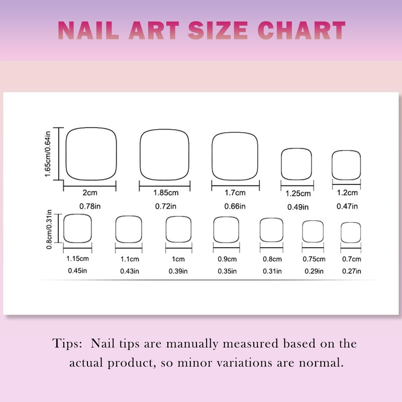 - 💖[Big Toe Friendly] Specially designed press on nails short styles include larger sizes to comfortably fit big toes without the awkward gaps common with standard false toenail sets. The contoured shape blends naturally with your nail bed for a realistic appearance.