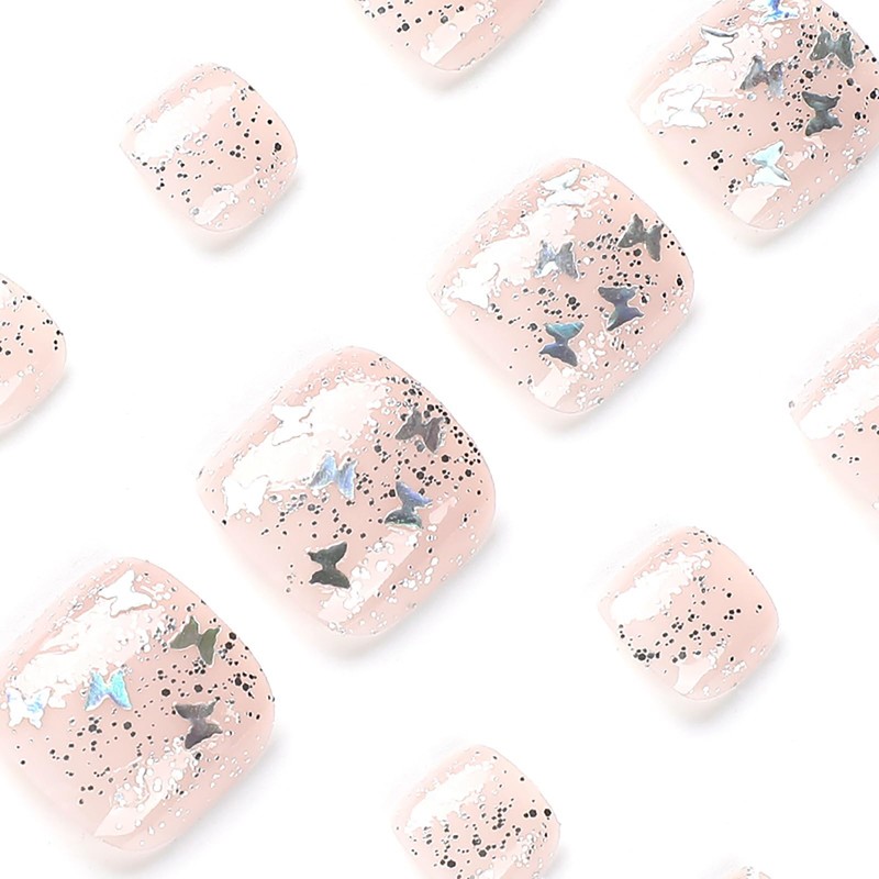 24Pcs Shining Press on Toenails Short Square Fake Toe Nails Butterfly Stick on Toenails Sliver Glitter Design Fake Toe nails Acrylic Nails Summer Manicure Glossy Toenails Press on Nails for Women