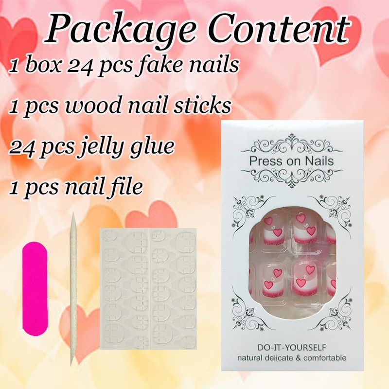 • Valentine's Day Nails Set :24Pcs Pink Heart Press on Nails Short Nails +1 Nail File + 24Pcs Jelly Glue Stickers+1 Wooden Stick.Durability of jelly glue is not as good as liquid glue, but it makes Valentines fake nails reusable