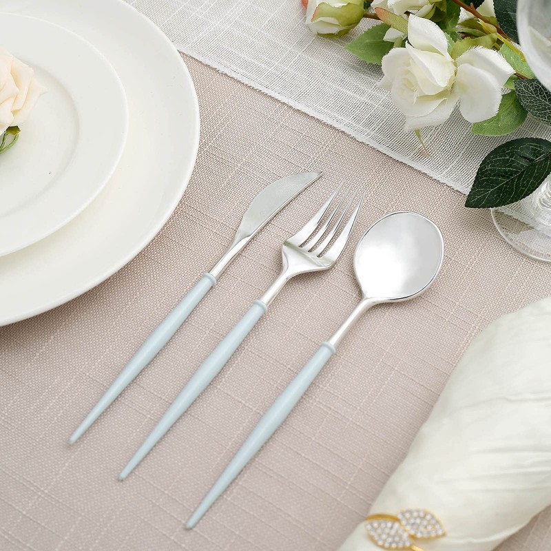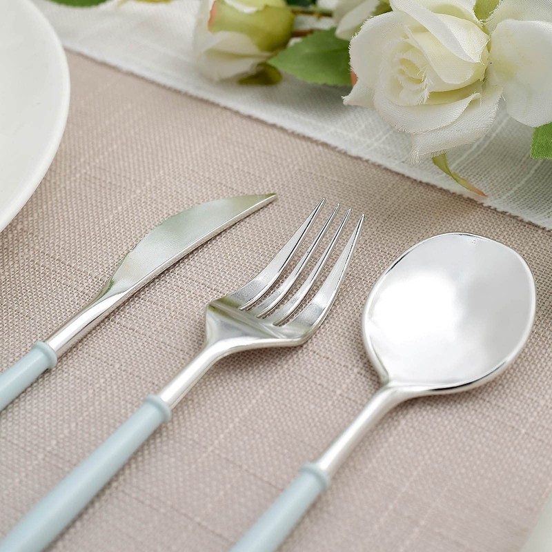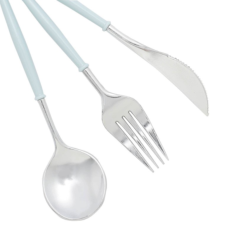 Exhibit style and sophistication and give your plain tables and place setting a chic and charming twist with our ornate disposable cutlery sets. Our Classy Disposable Flatware Collection combines the convenience of plastic with the charismatic appeal of real silverware. Eye-catching blue handle design coupled with Silver metallic finish makes these disposable cutlery pieces appear highly elegant. With their classic shape and high quality plastic material, this disposable ware is sure to add a WOW factor to your tablescape.
