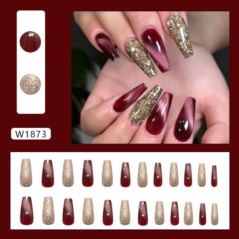 24STK Press on Nails Lange Sargform, Lila Rot Ombre Künstliche Nägel Fingernägel zum Aufkleben, Kunstnägel Gold Pailletten Fake Nails Klebe Nägel Set Acrylnagelspitzen Damen Nagel Zubehör