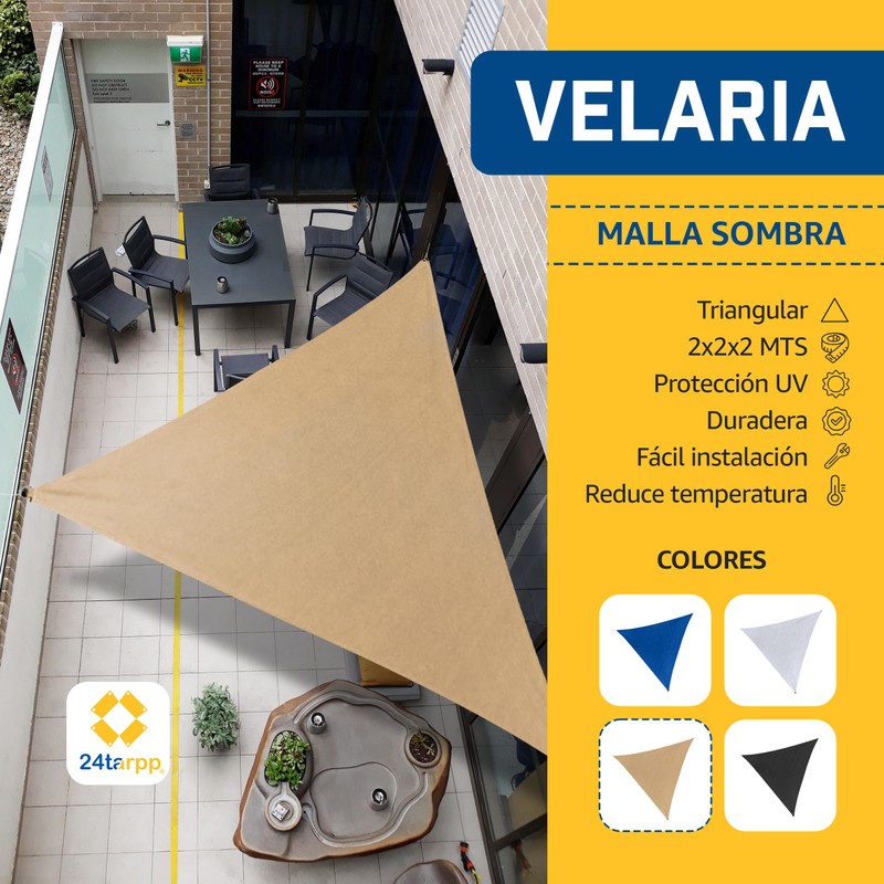 24tarpp Malla Sombra Velaria 2x2x2 - Triangular Beige - Mallasombra para Exteriores - Bastillas Dobles Reforzadas - Protección 90% Rayos UV - Lonasombra - Velaria 2x2x2 Beige