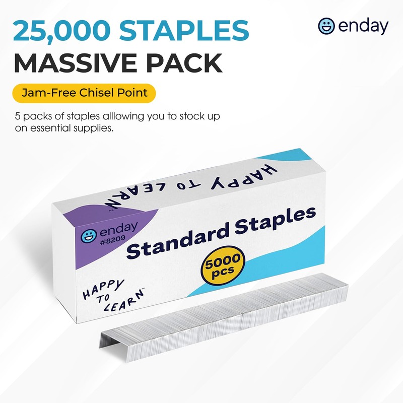 25,000 Standard Staples - 1/4 Inch Length, 210 per Strip, Jam-Free Chisel Point, Staples for Stapler, Replacement, Fits Standard Staplers, 5 Boxes of 5,000 Each, by enday