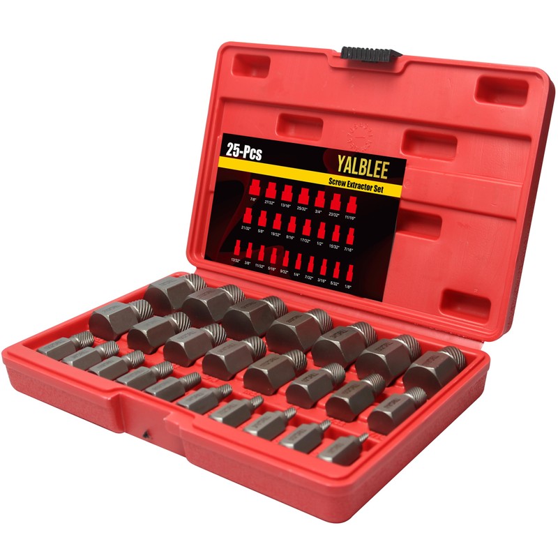 - 25-Pieces Bolt Extractors: A sturdy carrying box that keeps all the multi-spline screw extractors in order is included with the broken screw remover. Bolt extractors sizes include 7/8", 27/32", 13/16", 25/32", 3/4", 23/32", 11/16", 21/32", 5/8", 19/32", 9/16", 17/32", 1/2", 15/32", 7/16", 13/32", 3/8", 11/32", 5/16", 9/32", 1/4", 7/32", 3/16", 5/32", 1/8"