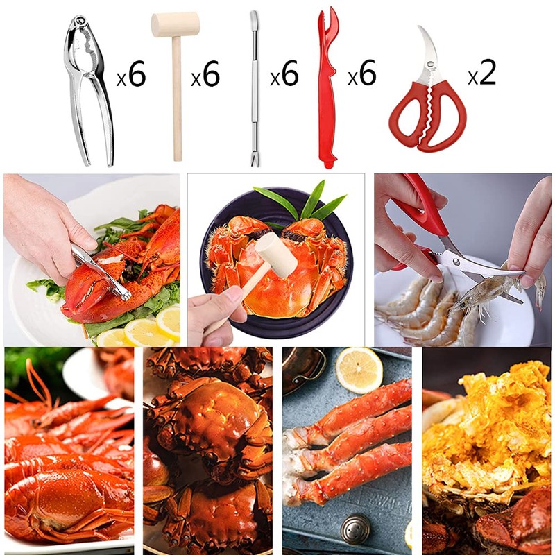 - [26 PCS Seafood Tools Set] This kit includes any essential to enjoy your seafood feast -- 6 crab crackers, 6 shellfish/seafood forks, 6 plastic lobster shellers, 2 seafood scissors and 6 crab hammers.