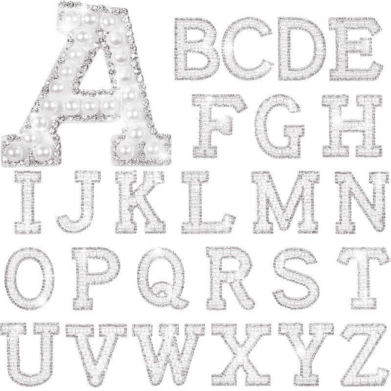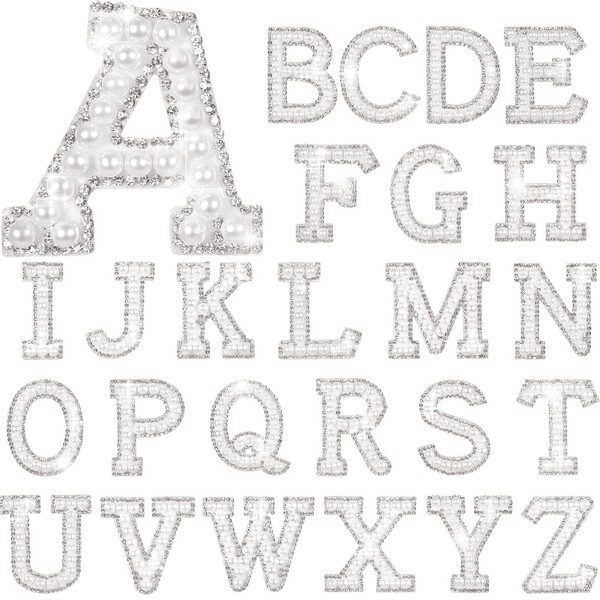 26 Piece Rhinestone Iron On Patch A-Z White Pearl Bling Rhinestone Letter Patch Glitter Alphabet Applique Rhinestone Pearl English Letter for DIY Craft Supplies (Solid White)