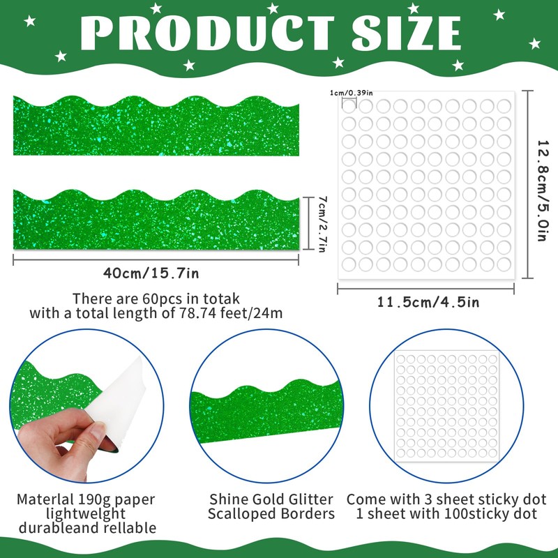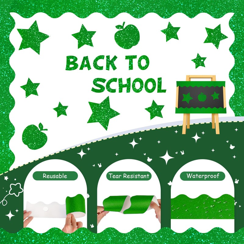 - Package Includes:Package contains 78.7 ft of 60 pcs of green bulletin borders, 40 pcs of 4 different sizes of glitter stars, 10 pcs of glitter apples, 78 pcs of glitter letters, 30 pcs of glitter numbers, 30 pcs of glitter numbers, and 300 glue dots, with plenty of letter cutouts enough to meet the needs of many arts and crafts projects.