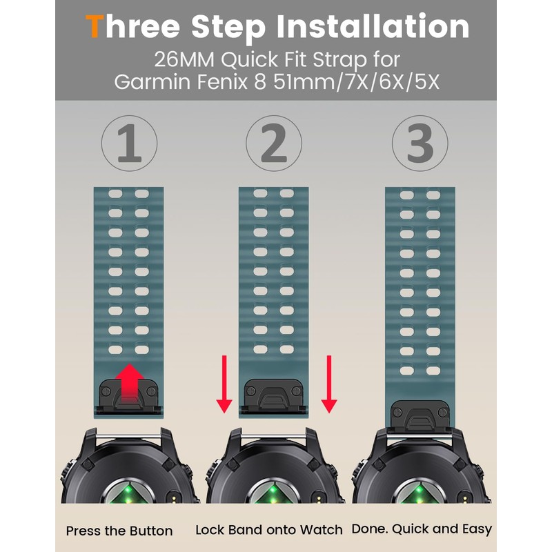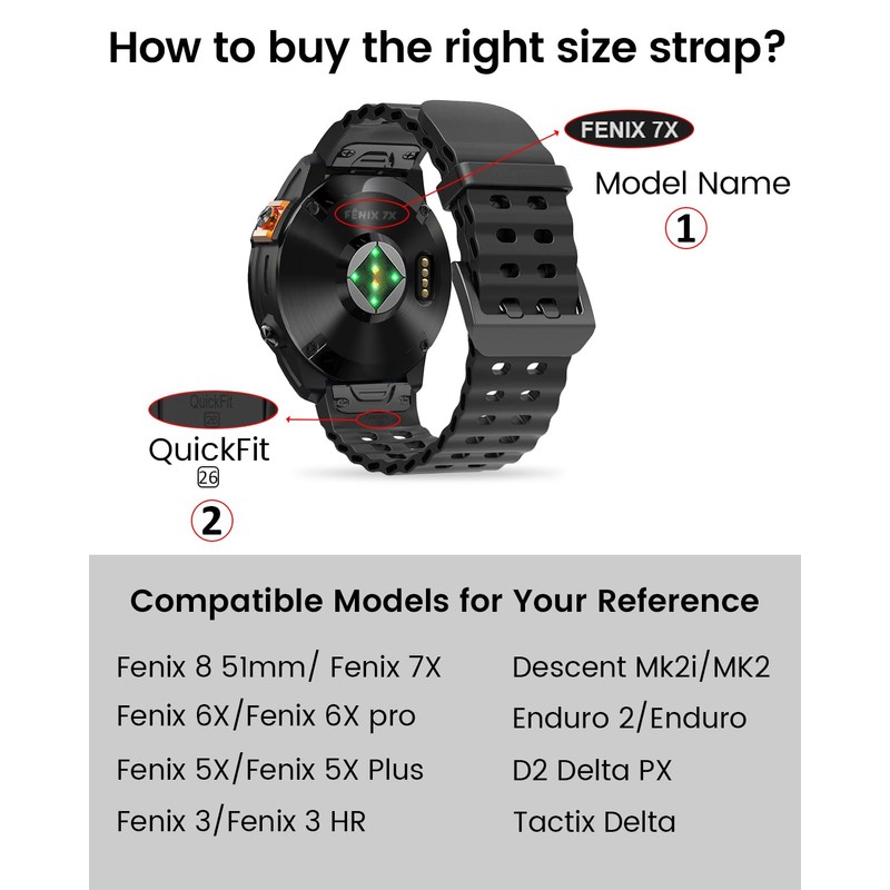 - Compatibility: This 26mm QuickFit band is compatible with Garmin Fenix 8 51mm, Fenix 7X, Fenix 6X/6X Pro, Fenix 5X/5X Plus, Descent MK2i, Descent MK1, D2 Delta PX, D2 Charlie, Tactix, Fenix 3/3 HR.