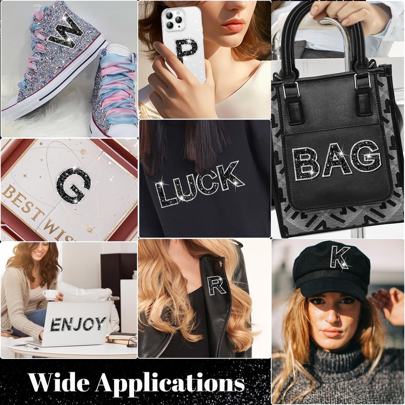 - [Wide Application] You can use these glitter letters rhinestone appliques to spell out your name or meaningful text to stick on your clothes or accessories. Perfect for decorating or repairing different types of clothes, you can use them to cover the worn part or broken area on your garments, such as T-shirts, jeans, hats, shoes, schoolbags, and other handicrafts.