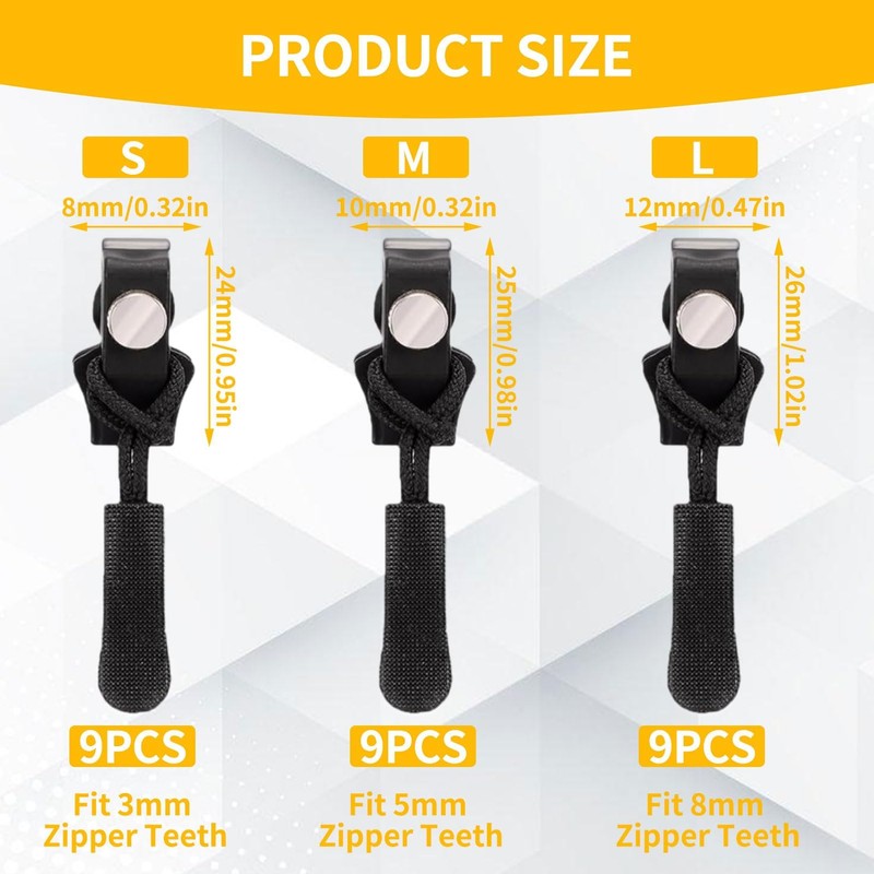 - VERSATILE ZIPPER REPAIR KIT: This 27-piece zipper repair kit includes zippers in 3 convenient sizes, which are perfect for a variety of zippers on clothes, backpacks, bags, luggage and more. With this zip fix kit, you can quickly repair zips and do the replacement yourself.