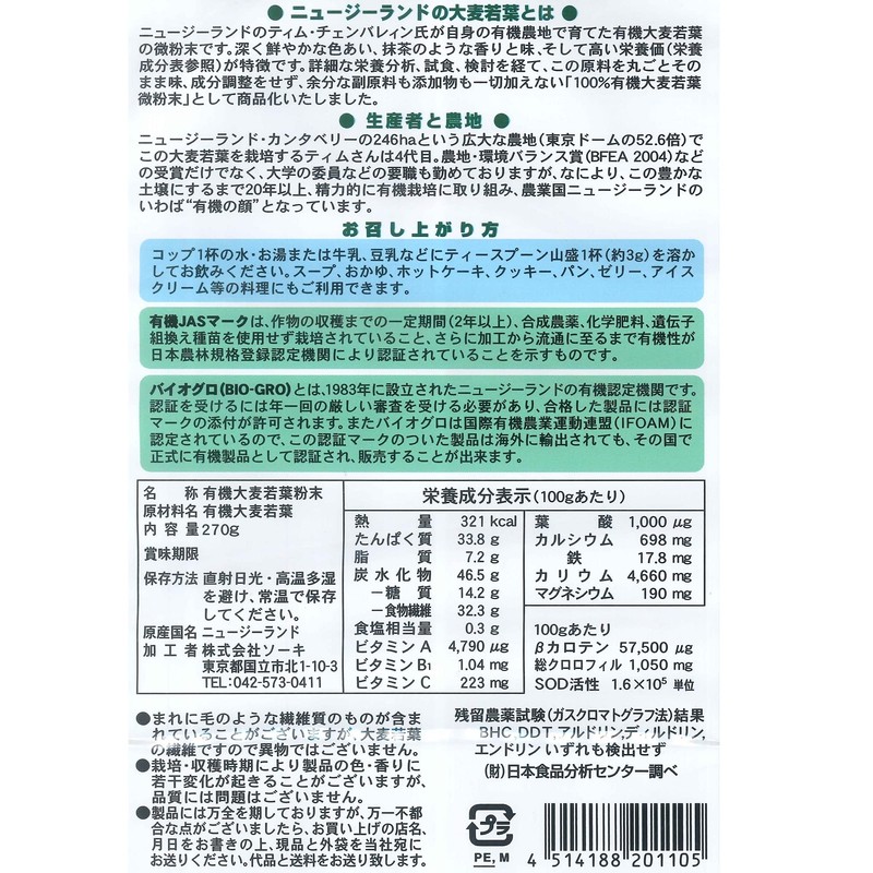 ソーキ ニュージーランドの大麦若葉 270g 青汁 有機JAS 食物繊維 葉酸 ビタミン ミネラル