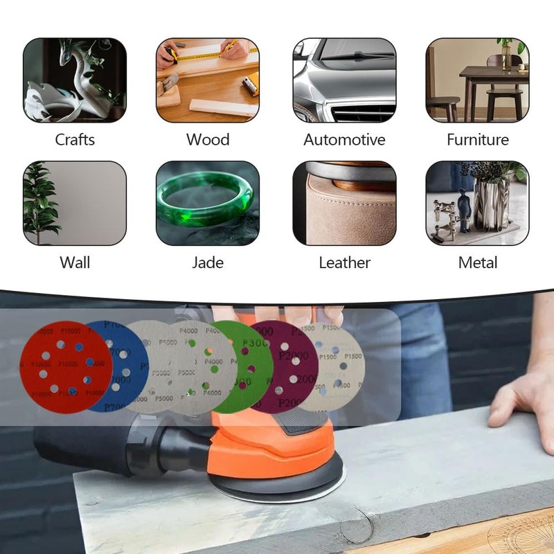 • ✨【Weite Anwendung】Schleifpapier scheibe Standard 8 Loch Design, kann zum Polieren und Polieren von Metall, Holz, Leder, Kunststoff, Stein, Glas und anderen Materialien verwendet werden. Es wird in Hardware-Formen, Autolackierung, Schiffbau, Tischlerei Möbel, Holzbearbeitung, Kunsthandwerk und anderen industriellen Bereichen verwendet.