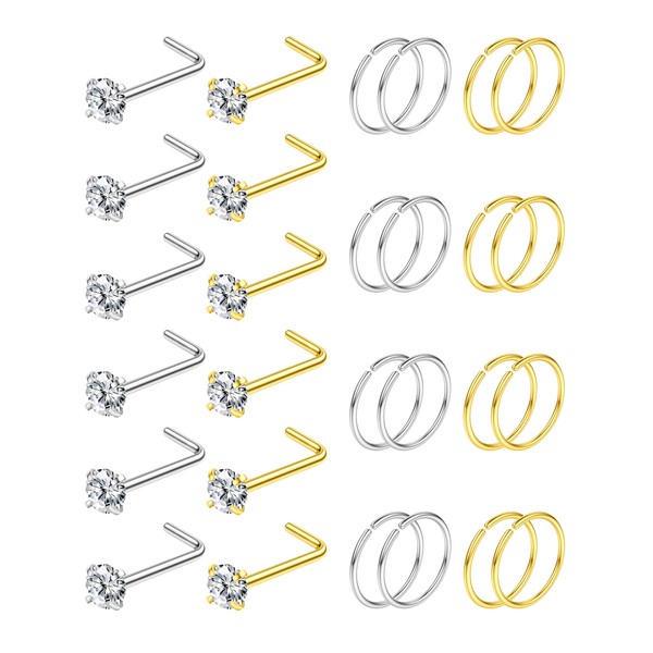 28PCS 20G Hypoallergenic Nose Rings Hoops Studs - 316L Stainless Steel Nose Ring for Women Men - Silver and Gold L Shaped CZ Nose Stud Hoop Nostril Piercings Jewelry Set 2.5mm CZ
