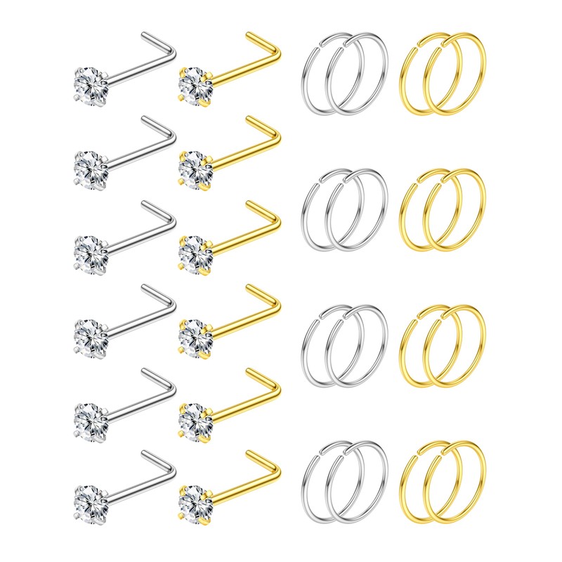 - Nose Piercing Jewelry Set - A Set of 28 PCS Stainless Steel Nose Rings. Including 12 PCS L Shaped Nose Studs, 16 PCS Nose Rings Hoops. Available in 7 Color Set (Silver Gold Rosegold Black Rainbow), Meet Your All Daily Needs