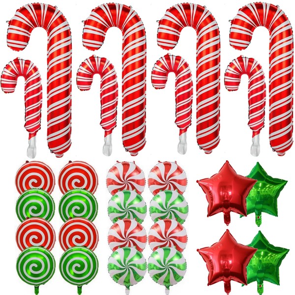 - Package Content: You will get 16 pcs of 2 styles candy balloons in two colors, 4pcs small red candy cane balloons, 4pcs big red candy cane balloons, 2pcs red star balloons, 2pcs green star balloons, 30pcs glue dot , 2pcs ribbon, 1pcs straw. Enough to decorate your Christmas party and adding atmosphere to Christmas, bringing you and your guest's delightful mood