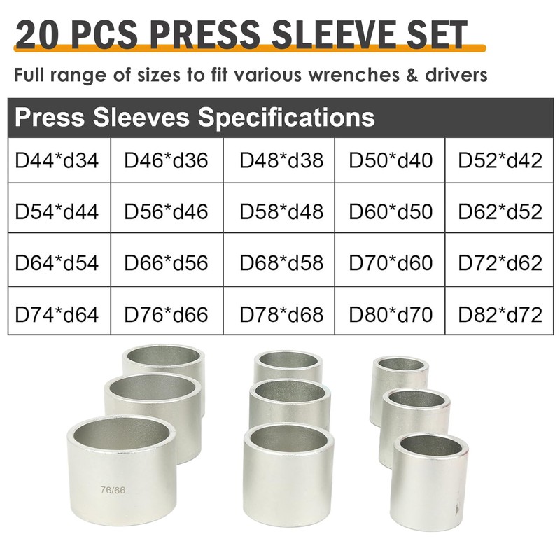 - Bearing press kit include outside Diameter: 44,46,48,50,52,54,56,58,60,62,64,66, 68,70,72,74,76,78,80,82mm