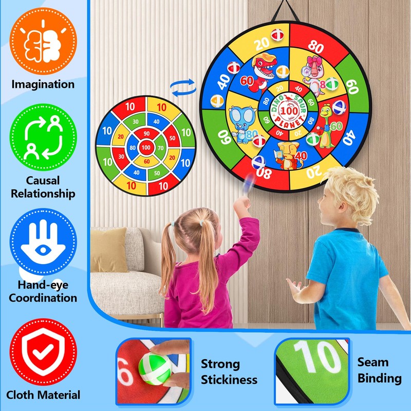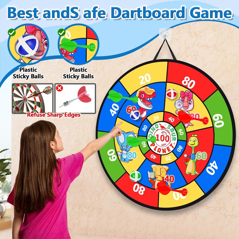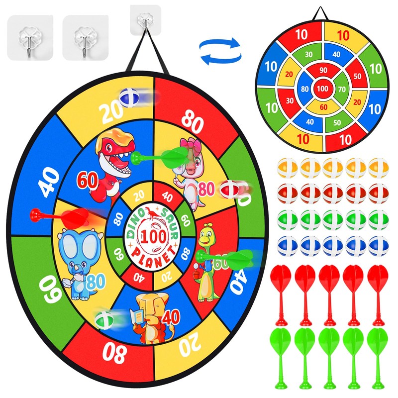 • 🎯【Kids Dart Board Set】With a diameter of 29 inches, the larger size of the board means more hits and more fun for kids or dart beginners.29 Inches Kids Dart Board Set Includes 1 x Large Double-Sided Collapsible Dart Board, 20xSticky Balls , 10xDarts, 2 x Hooks.