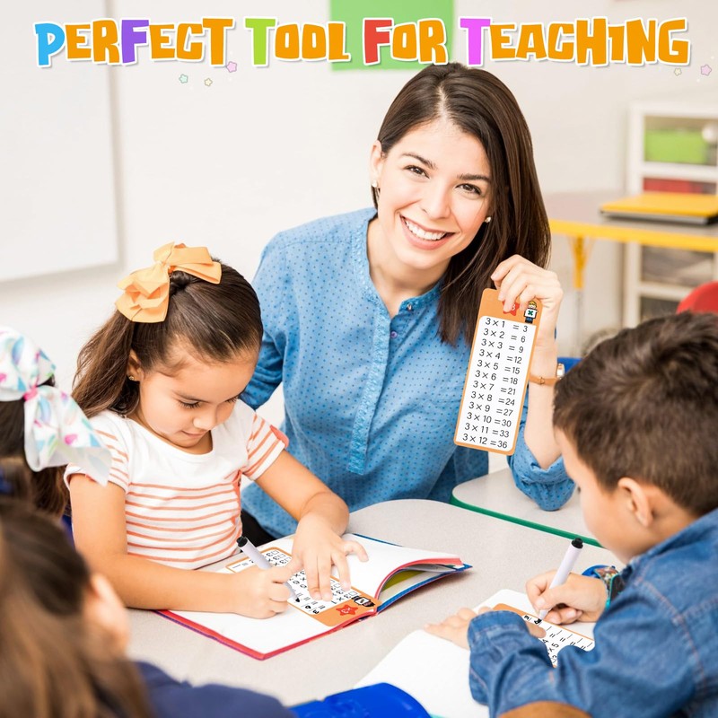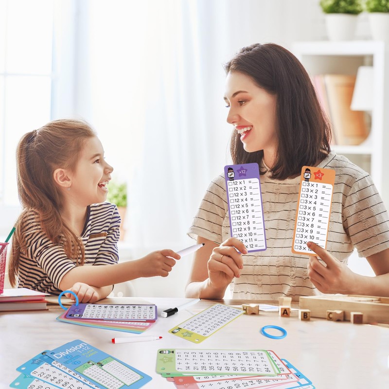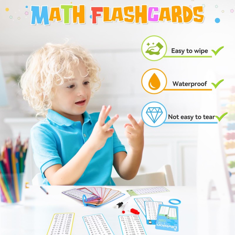 • 【Package Content】: The set includes 14 multiplication flashcards and 15 division cards, 4 erasable pens (black and red) and 2 plastic binder rings. With these flash cards, children can improve their arithmetic skills and develop stronger mathematical thinking by practicing