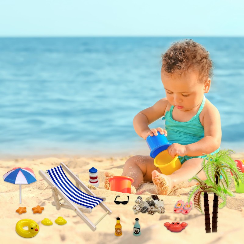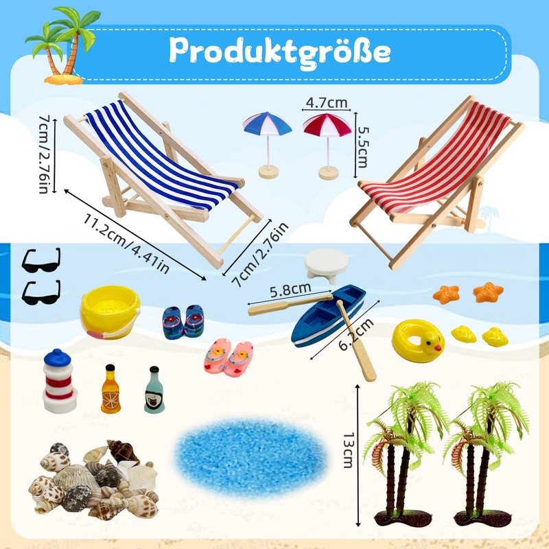 - Mikrolandschaftsdekoration besteht aus 29 Teilen mit reichhaltigen Accessoires und Details, darunter 2 Strandkorb, 2 Sonnenschirme, 2 Sonnenbrillen, 2 Kokospalmen, 1 Paar blaue Flip-Flops, 1 Paar rosa Flip-Flops, 2 Getränke, 2 Muscheln, 2 Seesterne, 2 Ruder, 1 Segelboot, 1 Leuchtturm, 1 Entenschwimmring, 1 Eimer, 1 runder Tisch, 1 Krabbe, 1 Schloss, Seesand und Muschel.