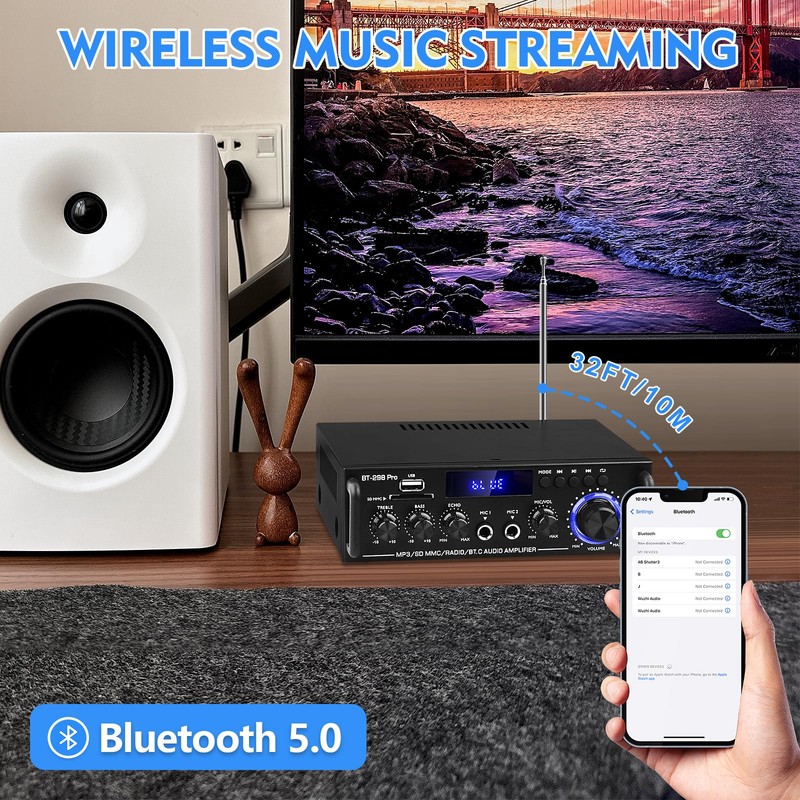 298Pro Receiver for Speakers, 5.0 Bluetooth Receiver for Home Stereo,RMS 400Wx2 Power Amp, Bass Treble Control,USB/SD/RCA/MIC/FM
