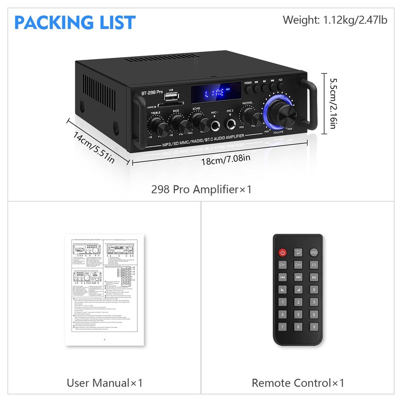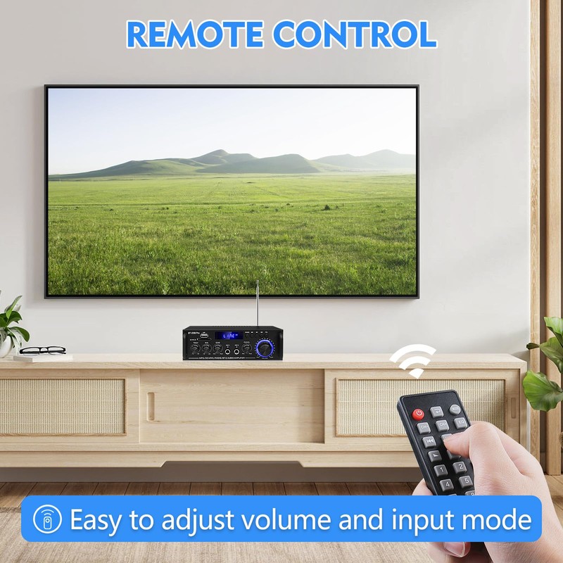 - Karaoke Amplifier: Bluetooth Amplifier Features 2 Microphone Inputs for an Instant Mini Karaoke Experience, Also Easy to Control Remotely Via Bluetooth and The Included Remote Control, Perfect for Parties, Gatherings, Recreation or Daily Meetings