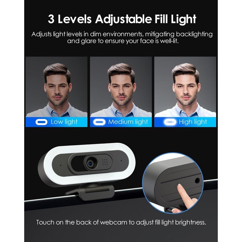 - 3 Levels Adjustable Fill Light ---- By touching on the back of webcam to switch fill light mode from RGB light mode. In fill light mode, you can adjusts light levels in dim environments, mitigating backlighting and glare to ensure your face is well-lit.