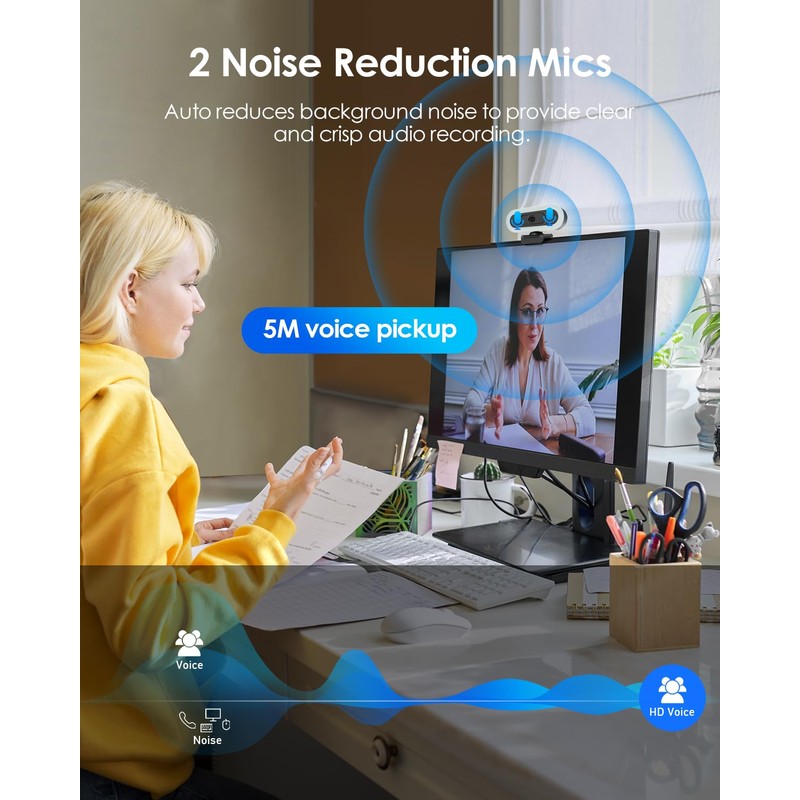 - Clear and Natural Sound ---- Built-in 2 microphone and professional individual audio chips, this usb webcams for laptop can automatically filter out background noise and echo, keyboard typing and other environmental noises, and deliver a clear voice pick up within the distance up to 5m/16ft. Clear and natural sound, No delay.