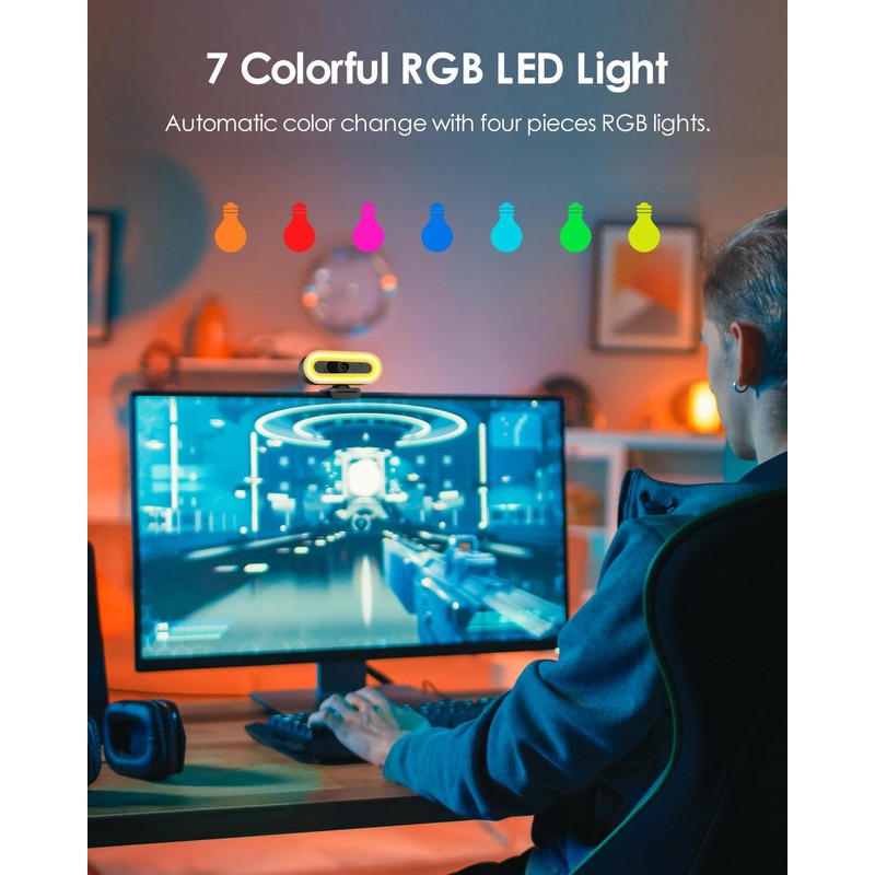 - Colorful RGB Lightings ---- This streaming camera comes with RGB ring lights. When you connect this camera to your computer and start the video software, the webcam will provide 7 colorful atmosphere light effects automatically (like Red / Yellow/ Purple and so on). That is good for game streaming.