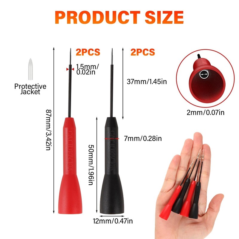- Versatile Application Range: These multimeter probe needles are engineered for diverse testing scenarios including automotive diagnostics, telecommunication systems, industrial equipment, and internal connector inspections. Their non-destructive design makes them ideal for cable testing across multiple industries without compromising wire integrity.