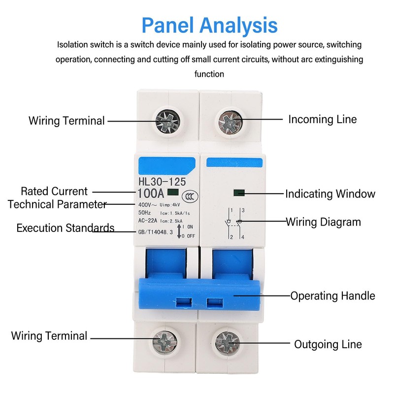 • Excellent Isolator Switch Our HL30 125 2P main switch is made of flame retardant PC material, ensuring the highest level of safety and durability.