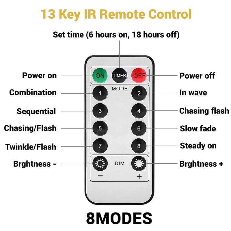 - Remote control & Timer: Wireless remote could control the light set within 20ft distance, it is convenient on rainy season or cold winter. There are 8 modes for your selection: combination, in wave, continuous change, slow glow, chasing/flash, slow flash, twinkle/Flash and steady on. Each mode with timer: 6 hours On and 18 hours Off automatically, helpful to save energy and extend the life span of batteries.