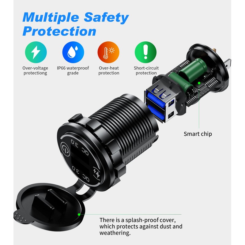 - IP66 Waterproof: Internal circuit adopts a completely enclosed design, the car charger USB port equipped splash cover for waterproof and dust-proof, This Waterproof USB socket can work well for Boat Marine