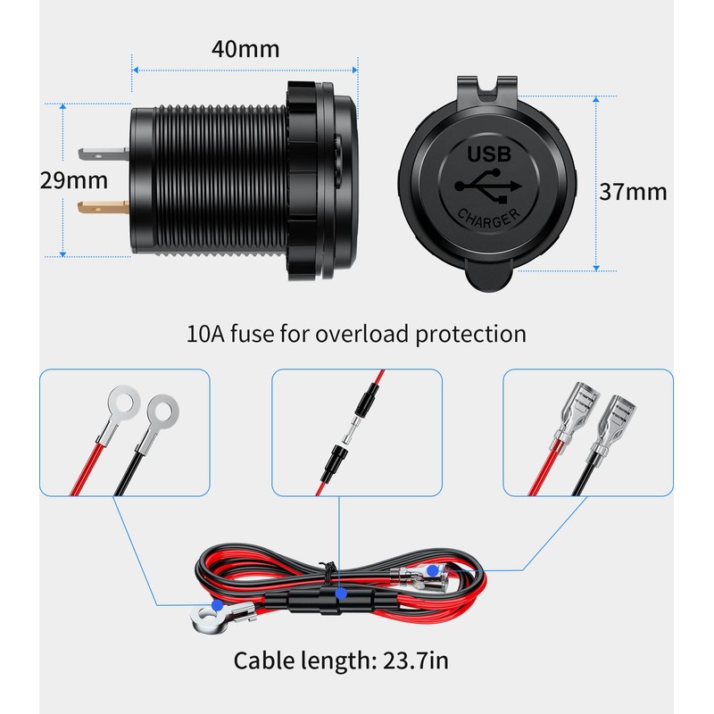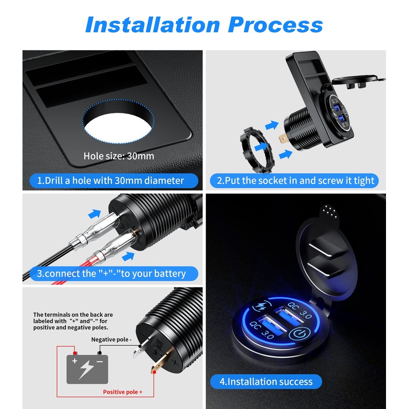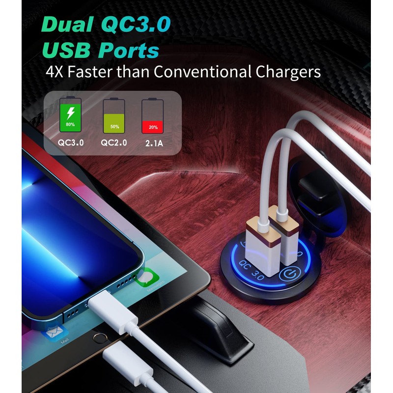 - Touch Switch & Blue LED: The 12V USB outlet is equipped with a power control switch, Turn off the switch when the USB socket is not in use, which can save the power of the vehicle battery, The blue LED light can help you check whether the circuit is connected successfully, and easily find the USB charging port in the dark environment