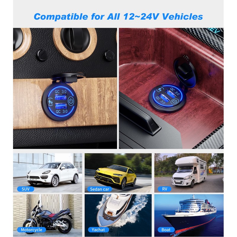 - Wide Compatibility: Quick charge 3.0 dual usb car charger DIY kit fit for DC 12V - 24V car, boat, marine, golf cart, ATV, RV etc. This USB socket is suitable for charging cellphones, tablets, power banks, video games controllers, sports watch and other digital equipment