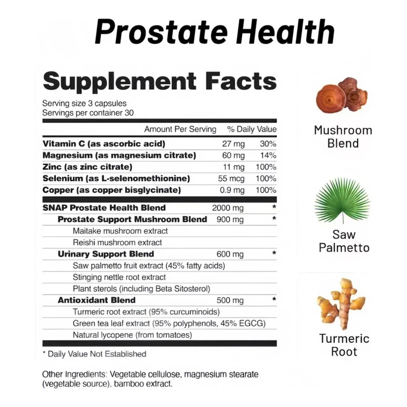 Saw Palmetto (320 mg): extracto estandarizado que ayuda a reducir el agrandamiento prostático leve y mejorar el flujo urinario.