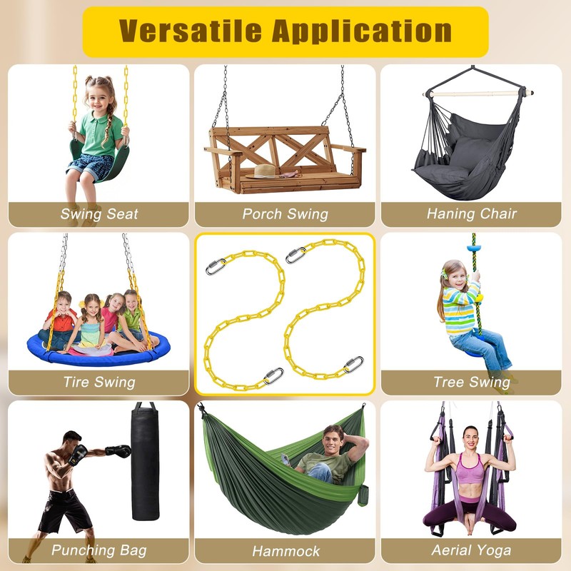 - Adjustable Length: Contains 2pcs 100 inch heavy duty yellow chains and 4pcs M7 2.6-inch carabiners, allowing flexible adjustment of suspension length to your needs.