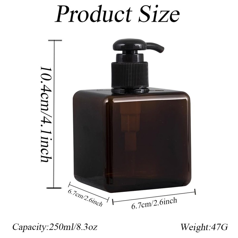 - Color:Brown; Capacity: 250 ml/8.3 oz; Size: Approx 6.7x6.7x10.4 cm/2.6x2.6x4.1 inch (Length x Width x Total Height); Weight:100 Gram(Pump Bottles+Packed); Material:Glass body,Plastic pump top