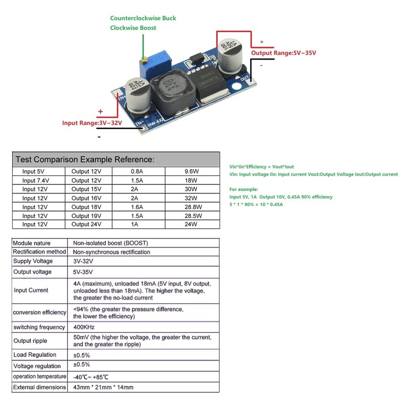 - Input Current:4A (max), no-load 18mA (5V input, 8V output, no-load is less than 18mA. Higher the voltage, the greater the load current.)