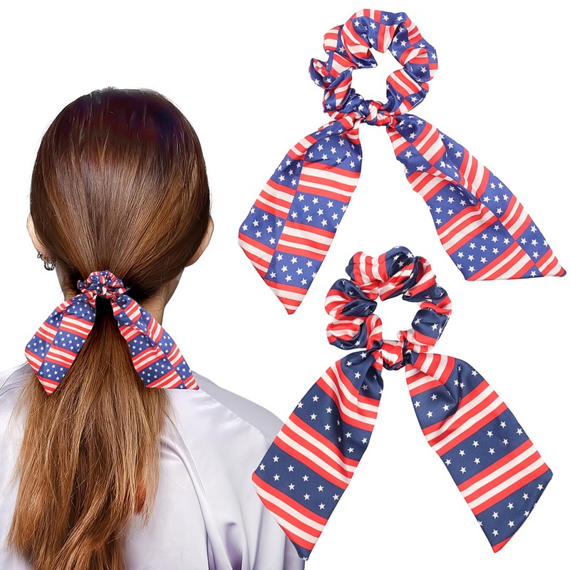 2PCS 4th July Hair Scrunchies for Women Girls American Flag Hair Tie Patriotic Star Hair Scarf Red White and Blue Ribbon Hair Bows Ponytail Holder Elastics Independence Day Hair Bands Hair Accessories
