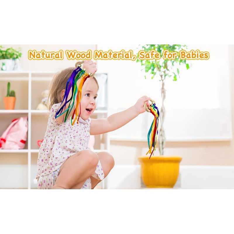Warm reminder: Since the baby's teeth are in the development stage, please don't let the baby bite the natural wooden rainbow ribbon bracelet toy. You can remove the bell and ribbon when biting.