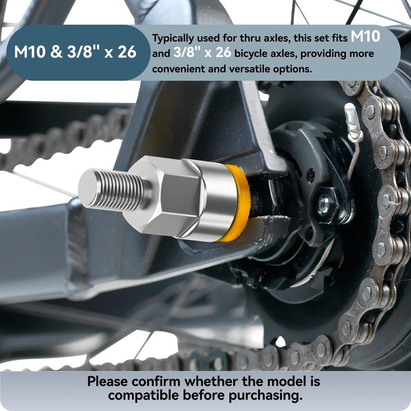 - Bicycle Adapter Compatibility-We recommend checking to see if our products size match your bike's axle before purchasing.This is a bicycle hub hitch adapter kit specially designed for M10x1.0, 3/8" x 26 solid shafts,it is an excellent choice for families with two bicycles of compatible models