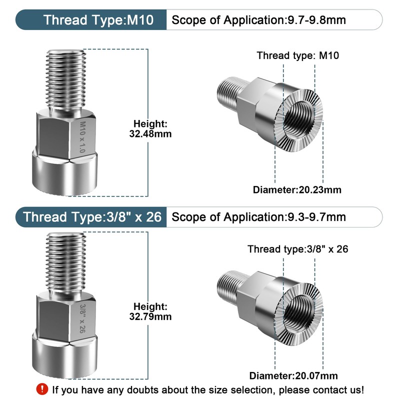 It is specifically applicable to the solid shaft with a diameter of M10x1.0 and the solid shaft with an inner diameter of 9.3 - 9.7 mm and a thread size of 3/8"x26. The bicycle trailer axle is clearly marked with the applicable dimensions, and it comes with an instruction manual,so you don't need to spend any time distinguishing them.