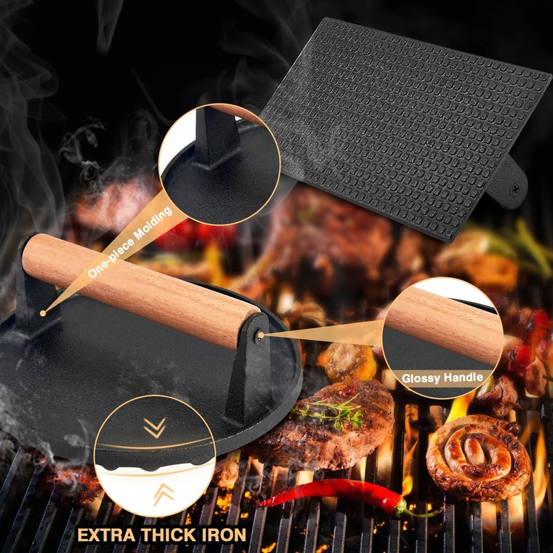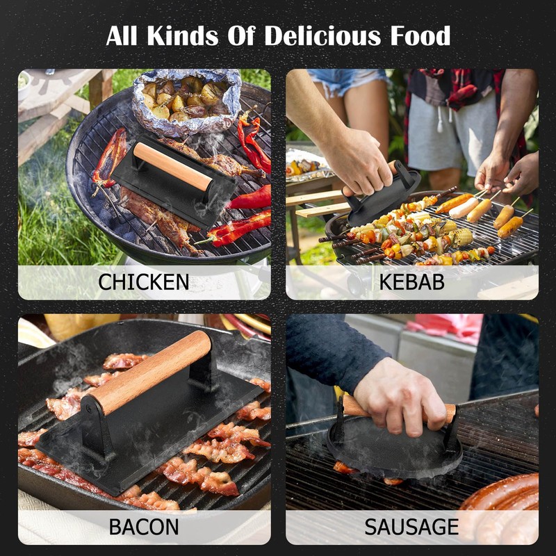 Joyfair Grill Press Set is made of heavy gauge iron, free from harmful substances, Healthy and safe for your daily cooking use.