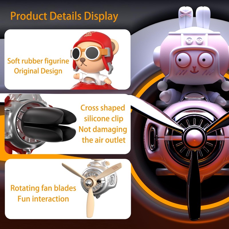 - Brand New Cartoon Creative Shape: brand new pilot-shaped air freshener, each pilot shape is brand new and unique, with retro aircraft elements. The cute pilot head is connected to the fuselage by a spring design. As the car moves, the pilot's head will swing cutely. This cute action adds more fun to every driving. It not only satisfies the fragrance diffusion function, but also turns ordinary driving into an interesting experience.