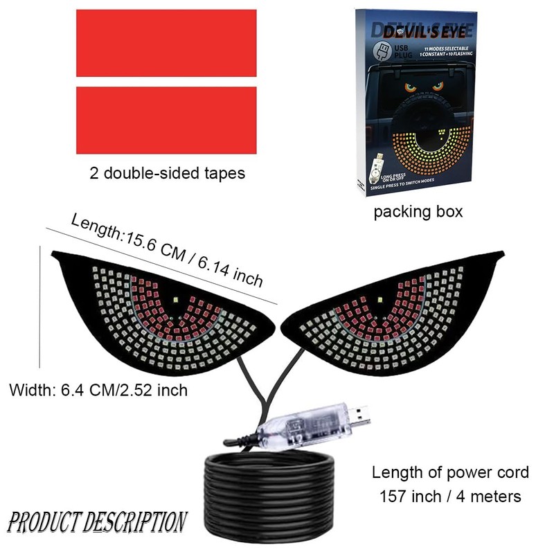 - USB plug and play: Our demon eye lights with 5V USB interface plug and play,157 inches (4 meters) of cable long enough to connect to the USB port on the front central console of the car,when someone is driving very badly,send a cool demon eye light warning signal to front/back vehicle