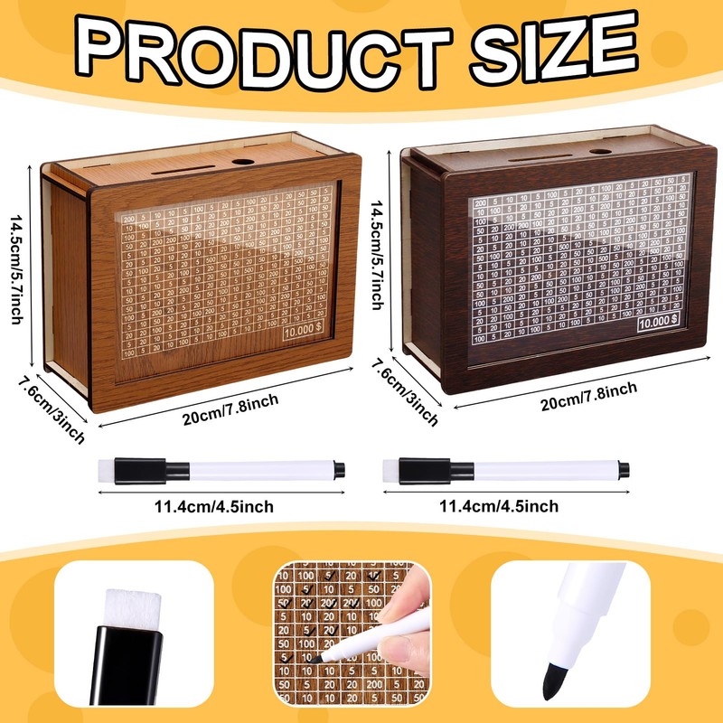 2PCS Cash Vault Wooden Savings Box 10000 The Challenge Piggy Bank, Money Vault Savings 10k, Cash Coin Retro Money Savings Box with Counter, Money Box for Kids Adults (Darkbrown/Lightbrown)